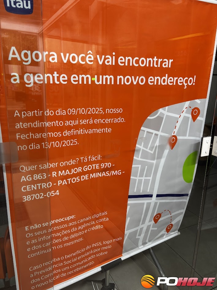 Com o fechamento em Presidente Olegário, a agência do Itaú mais próxima é em Patos de Minas, localizada na Rua Major Gote, 970 centro.