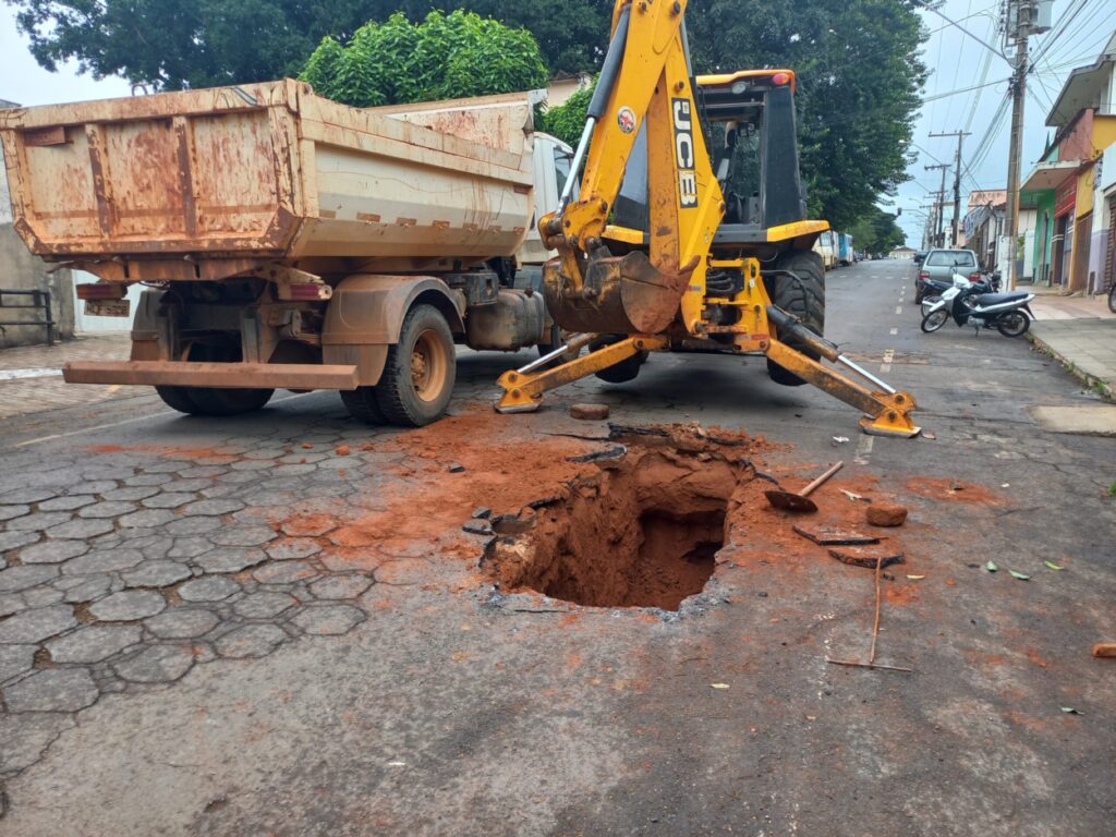 Asfalto cede e abre cratera no centro de Presidente Olegário
