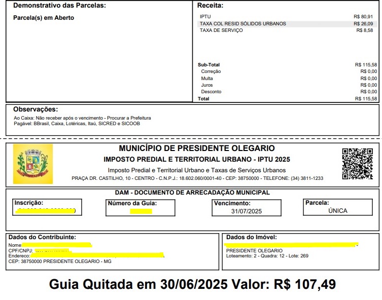 Termina nesta segunda-feira (30) prazo para pagamento do IPTU com desconto em Presidente Olegário