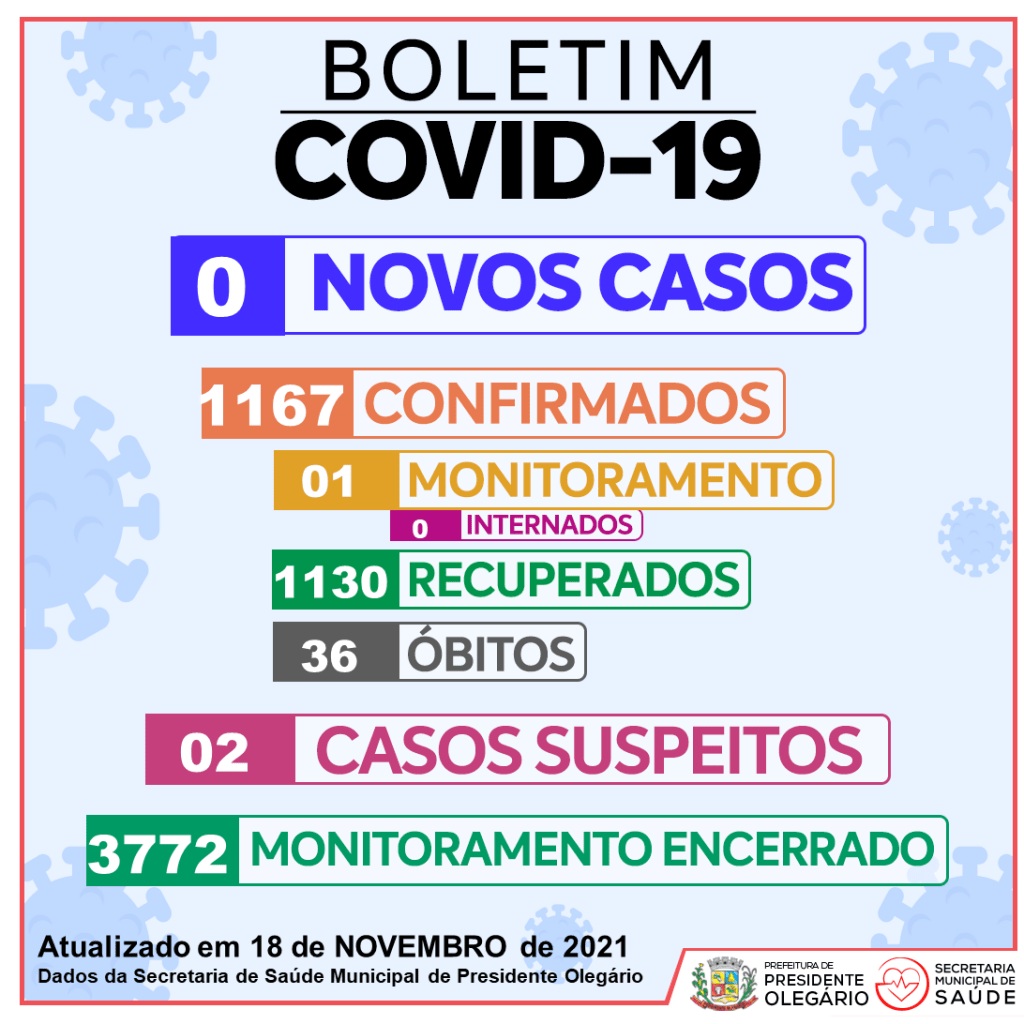 O municÃpio tem 1.167 casos confirmados da Covid-19, 1.130 pacientes estão curados da doença e foram liberados do isolamento. Um paciente testado positivo está em isolamento domiciliar e tem 36 óbitos confirmados.