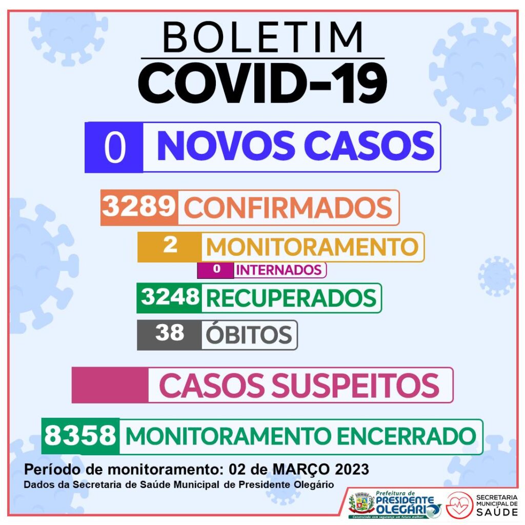 A Secretaria Municipal de Saúde de Presidente Olegário (SMS) divulgou nesta quinta-feira (2), um novo Boletim Epidemiológico e mostra que o município não registra casos positivos da doença há 2 dias. O total de positivos é de 3.289.