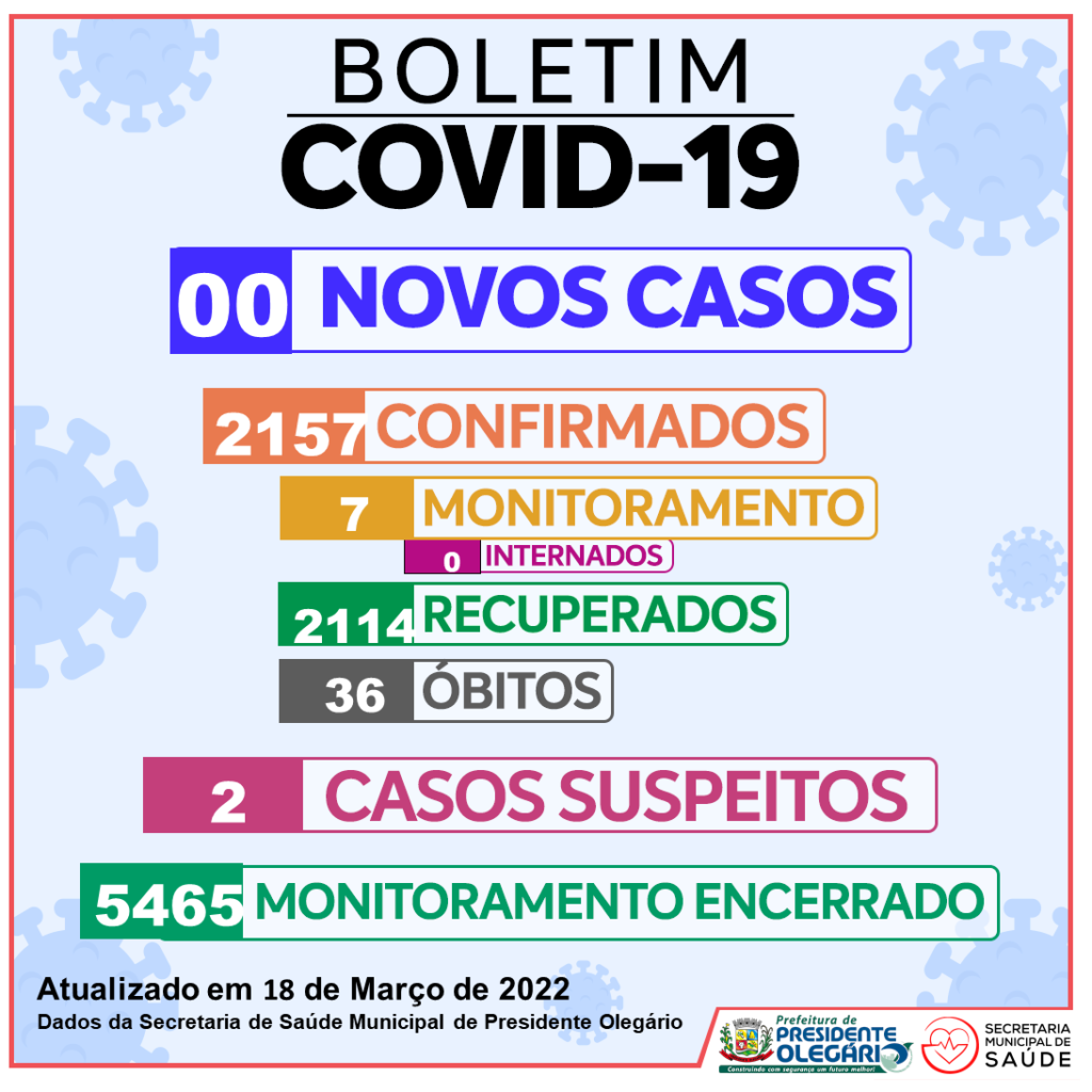 A Secretaria Municipal de Saúde (SMS) divulgou nesta sexta-feira (18), um novo Boletim Epidemiológico no site da Prefeitura de Presidente Olegário e mostra que o município não registrou casos positivos nas últimas 24h. O total de positivos é de 2.157.