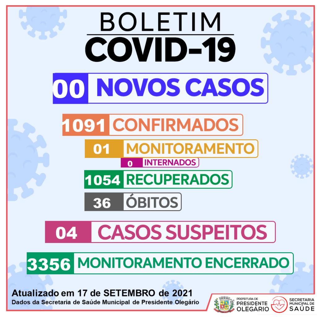 A Secretaria Municipal de Saúde (SMS) divulgou na tarde desta sexta-feira (17), um novo boletim epidemiológico no site da Prefeitura de Presidente Olegário, o município não registrou casos positivos da Covid-19 nas últimas 24h. O total de positivos é de 1.091.