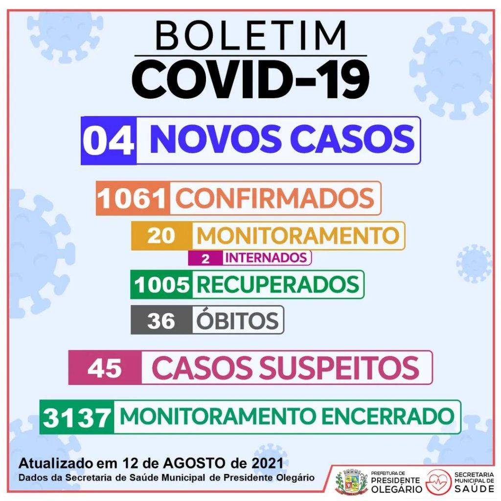 A Secretaria Municipal de Saúde (SMS) divulgou na tarde desta quinta-feira (12) um novo boletim epidemiológico no site da Prefeitura de Presidente Olegário, o municÃpio registrou 4 casos positivos da Covid-19 nas últimas 24h. O total de positivos é de 1.061.