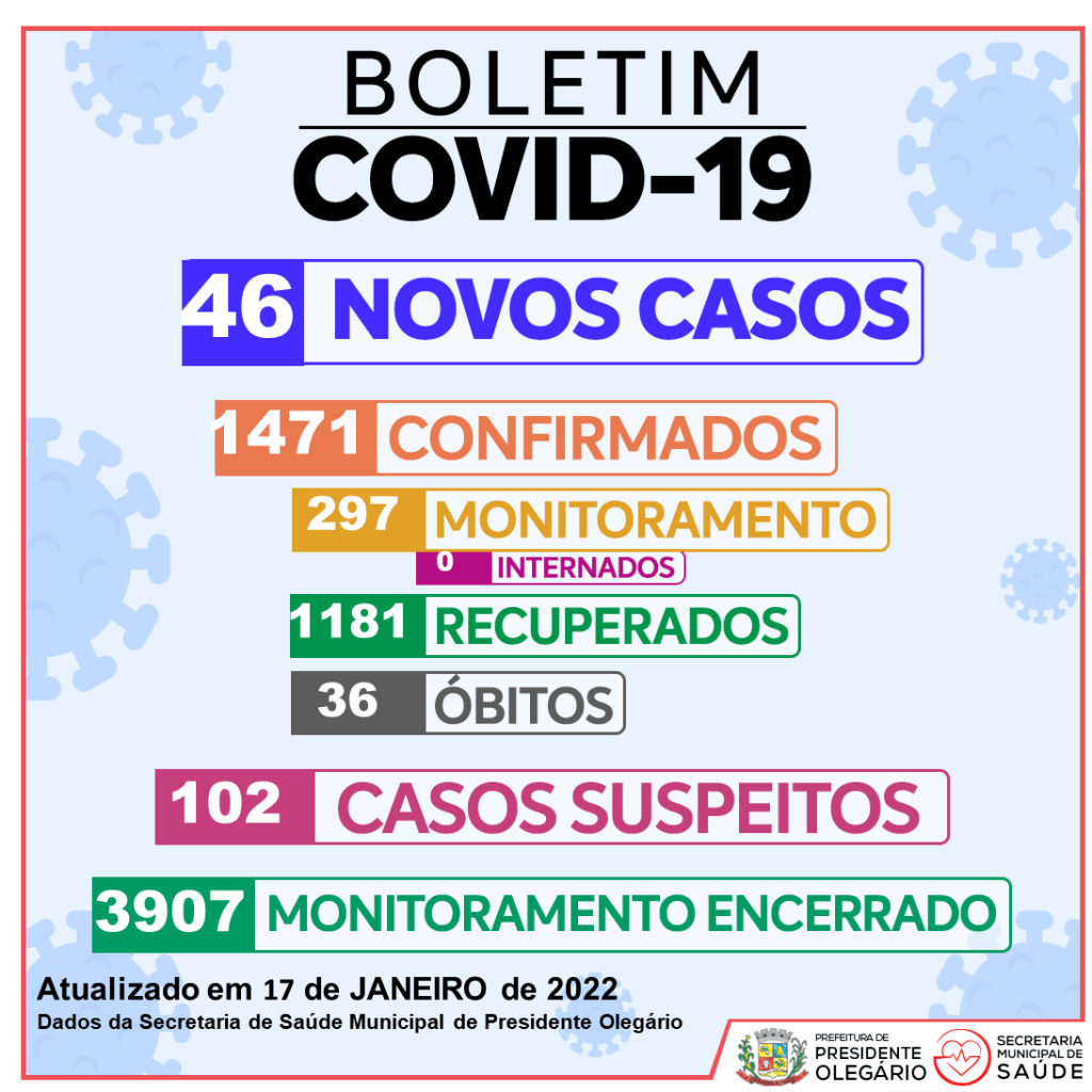 A Secretaria Municipal de Saúde (SMS) divulgou nesta segunda-feira (17), um novo Boletim Epidemiológico no site da Prefeitura de Presidente Olegário e mostra que o municÃpio registrou 46 casos positivos nas últimas 72h, o dados são divulgados somente em dias úteis. O total de positivos é de 1.471.