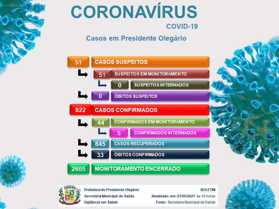 O municÃpio tem 922 casos confirmados de coronavÃrus, 845 pacientes estão curados da doença e foram liberados do isolamento. Trinta e nove pacientes testados positivos estão em isolamento domiciliar, 5 estão internados e tem 33 óbitos confirmados.
