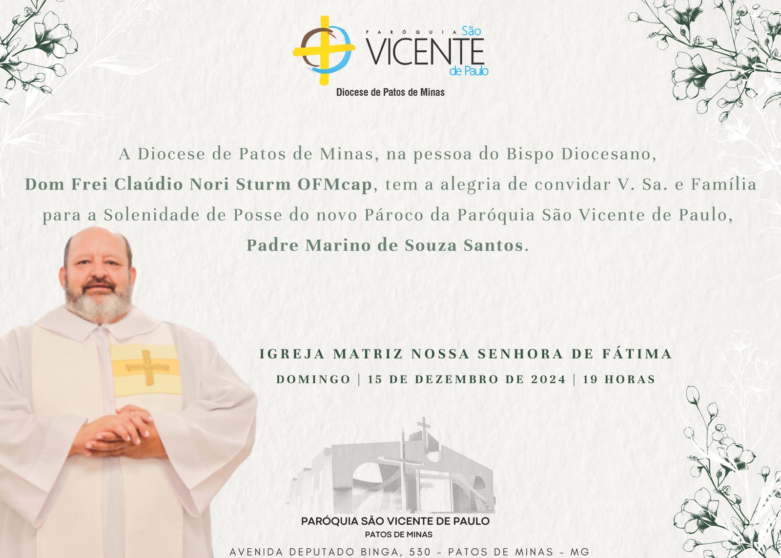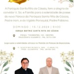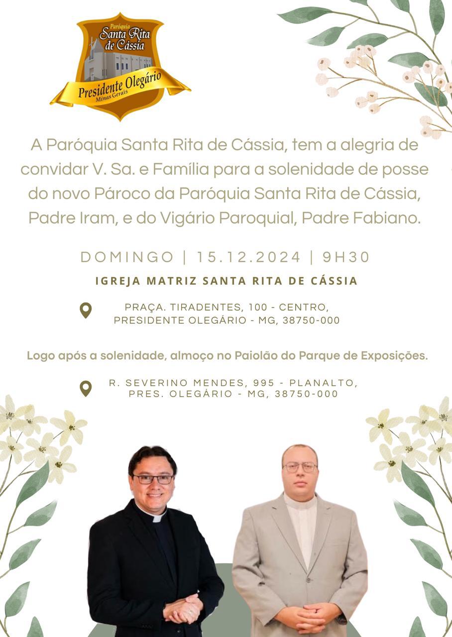 A solenidade de posse do novo pároco e vigário será no dia 15 de dezembro, às 9h30min na Igreja Matriz de Santa Rita de Cássia, logo após será realizado um almoço no Paiolão do Parque de Exposições Antônio Secundino de São José.