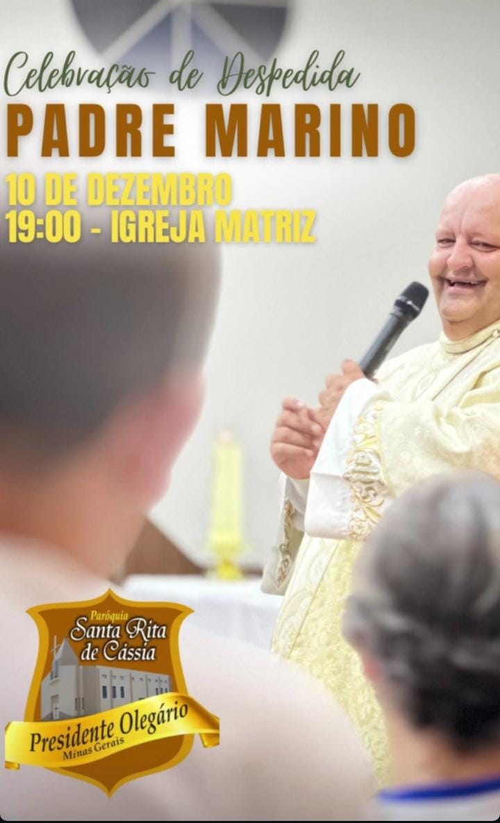 O atual pároco de Presidente Olegário, padre Marino Santos que completa aproximadamente 5 anos, a frente da Paróquia Santa Rita de Cássia vai assumir a Paróquia São Vicente de Paulo na cidade de Patos de Minas, no dia 15 de dezembro, às 19h. Antes nesta terça-feira (10), tem a missa de despedida na Matriz de Santa Rita de Cássia em Presidente Olegário, às 19h.