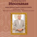 Já o novo vigário, padre Fabiano Ciribelli Santos Pompêu, tem 34 anos, sendo 7 anos de ordenação sacerdotal, atualmente é o Reitor do Seminário Menor Monsenhor Josias Tolentino de Araújo em Patrocínio. É natural de Uberlândia e filho de Daniel Santos Pompêu e Alessandra Ciribelli Santos Pompêu.
