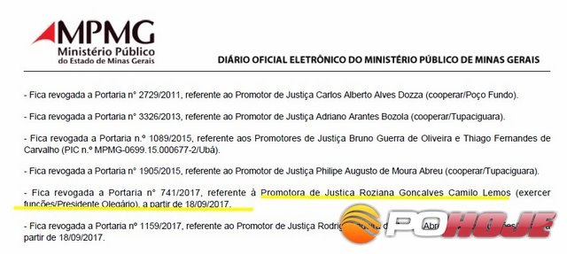 A promotora de Justiça Roziana Gonçalves Camilo Lemos, que era responsável pelo Ministério Público da Comarca de Presidente Olegário, foi transferida , desde o dia 18 de setembro.