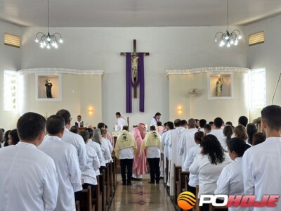 Com a Matriz repleta de fiéis, logo após a leitura do Decreto de Nomeação de pároco, Pe. Iram Alves Martins Júnior e vigário paroquial, Pe. Fabiano Ciribelli Santos Pompêu, o novo pároco realizou a profissão de fé.